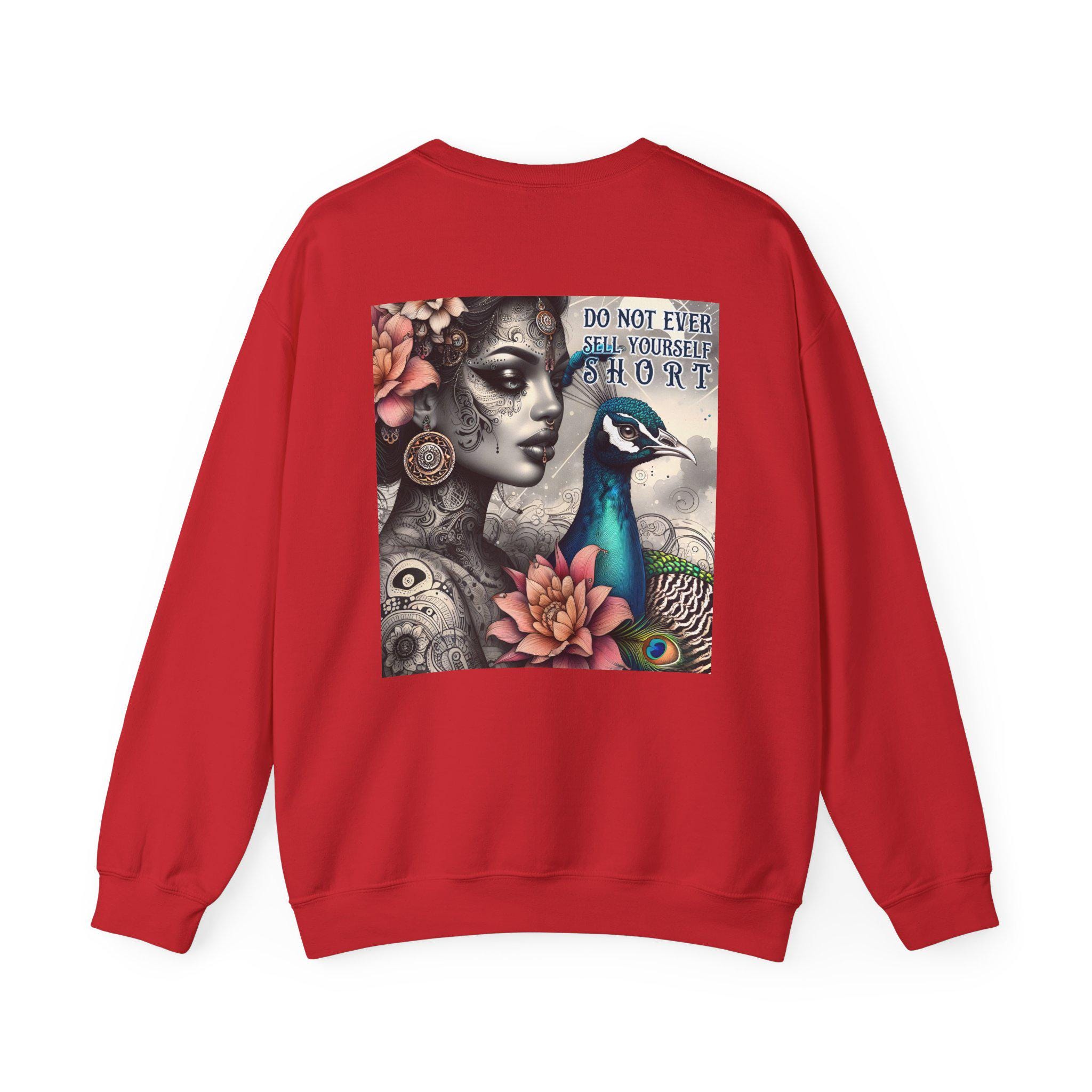 This cozy crewneck sweatshirt blends street-ready comfort with bold, artful expression. Printed on a medium-heavy 50/50 cotton–poly blend, it wears like a reliable favorite: soft against the skin, structured at the neckline, and built to last with double-needle stitching. The back features a striking, tattoo-inspired art print—an elegant, slightly mysterious portrait with a peacock and floral accents—that reads like a wearable canvas. Subtle production details (DTF inner neck label, tear-away tag, OEKO-TEX dyes, ethically grown US cotton) mean you get lasting quality with mindful finishes. Throw it on for slow mornings, gallery walks, or nights out when you want warmth, attitude, and art in one piece.