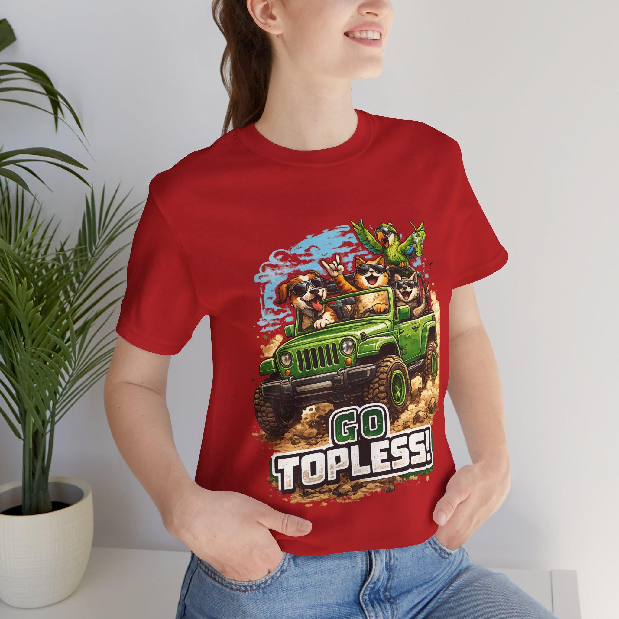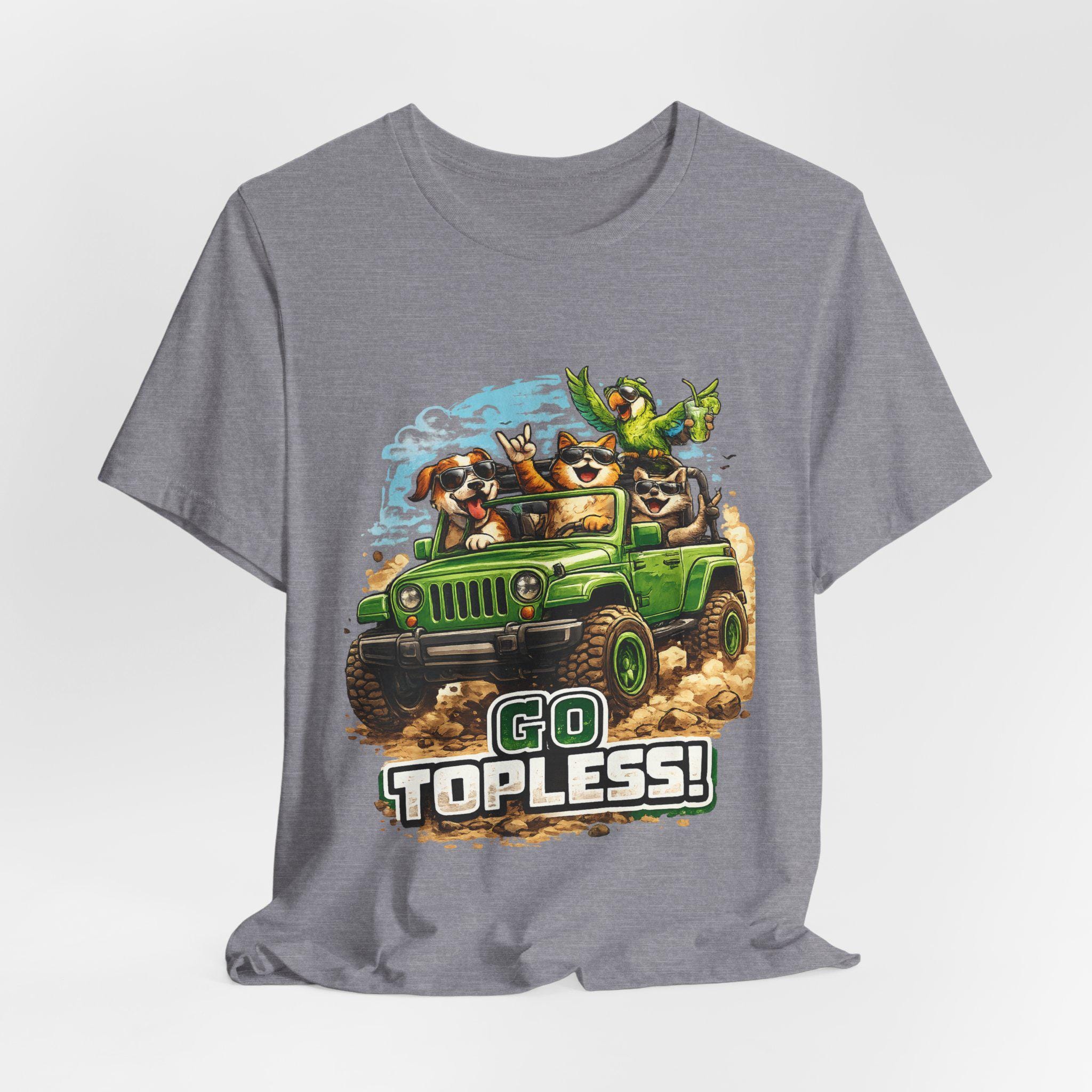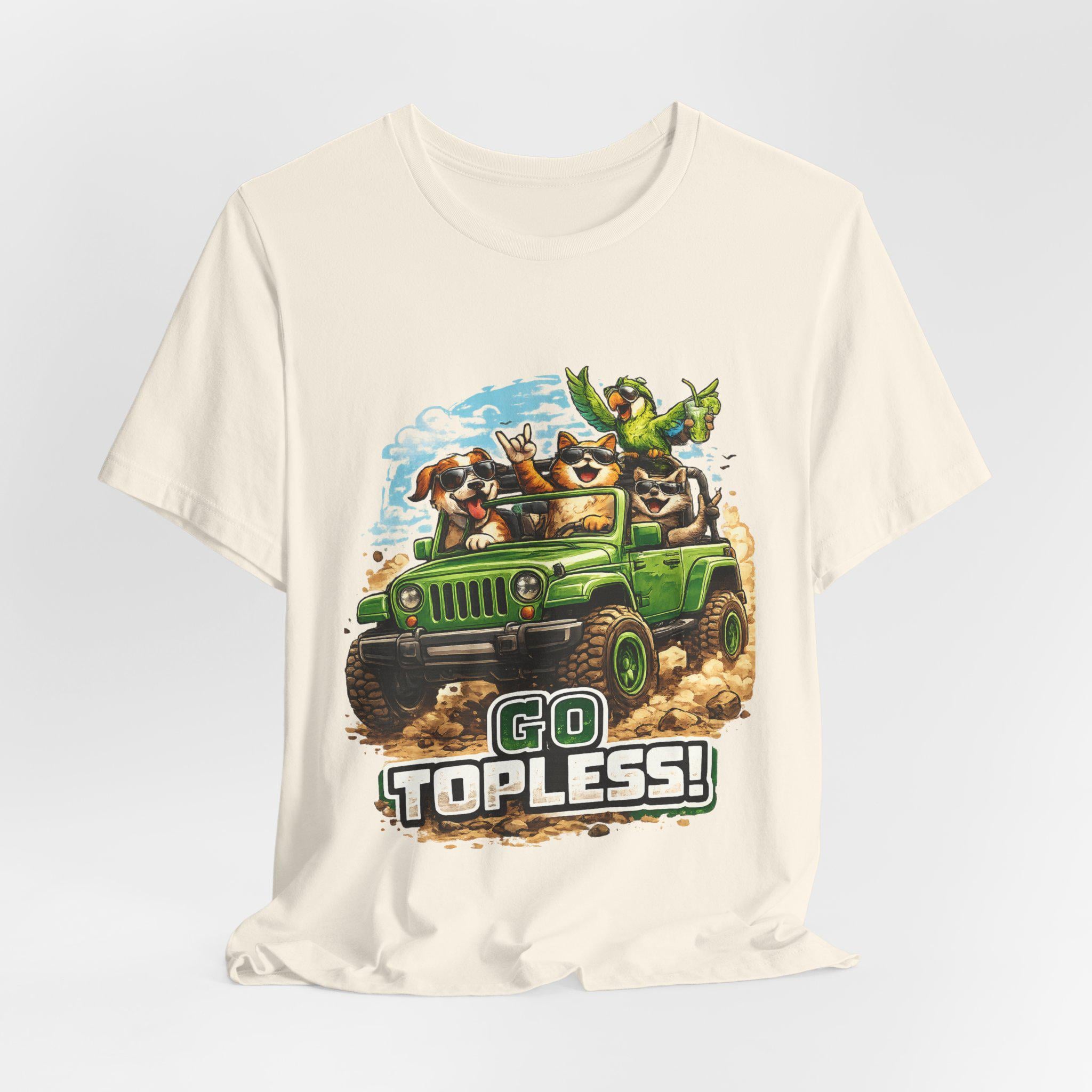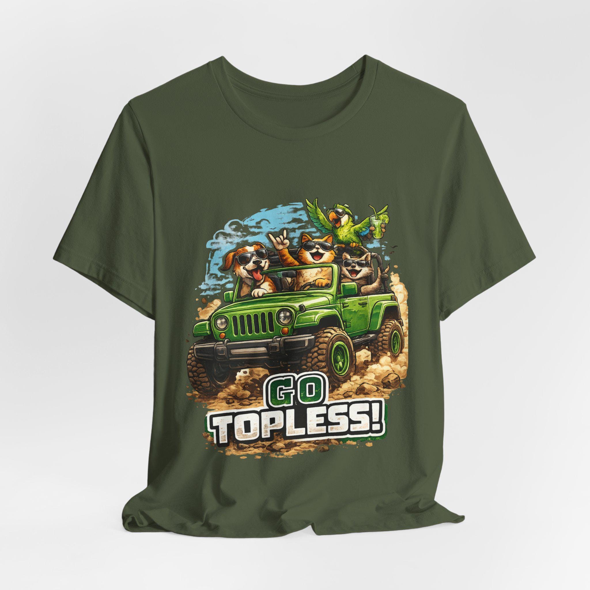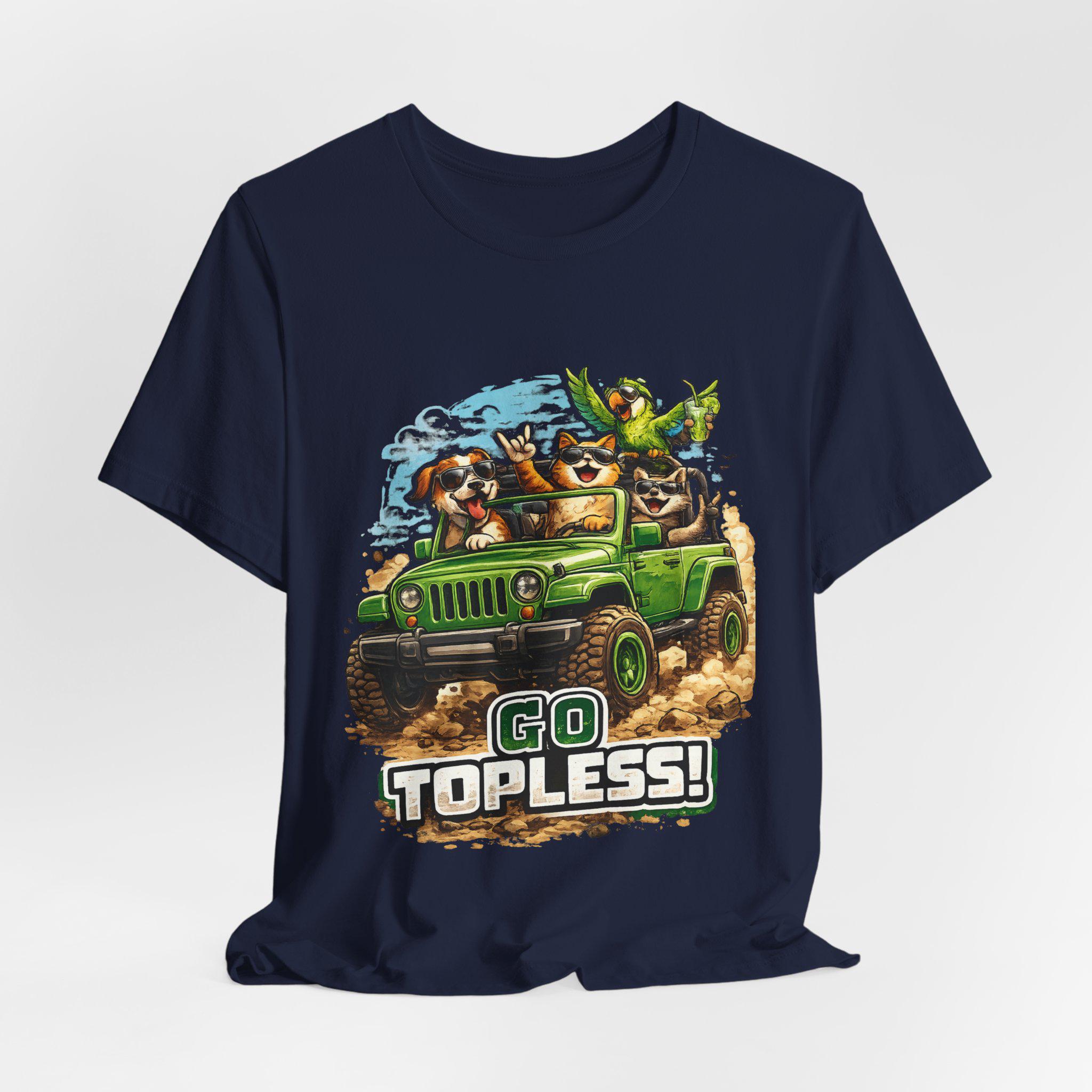 Hit the trail with a tee that feels like a sun-soaked weekend escape. This lightweight jersey shirt wears in softly and breathes during long days on the road or at the beach. A bold, vintage-style illustration of friends driving a green jeep with the playful rallying cry “GO TOPLESS!” sits on the chest — loud, carefree, and a little mischievous. It layers easily under an open flannel or stands alone when the temperature climbs. Wear it to beach runs, off-road meetups, backyard barbecues, or whenever you want to signal that today is about open air and good company.