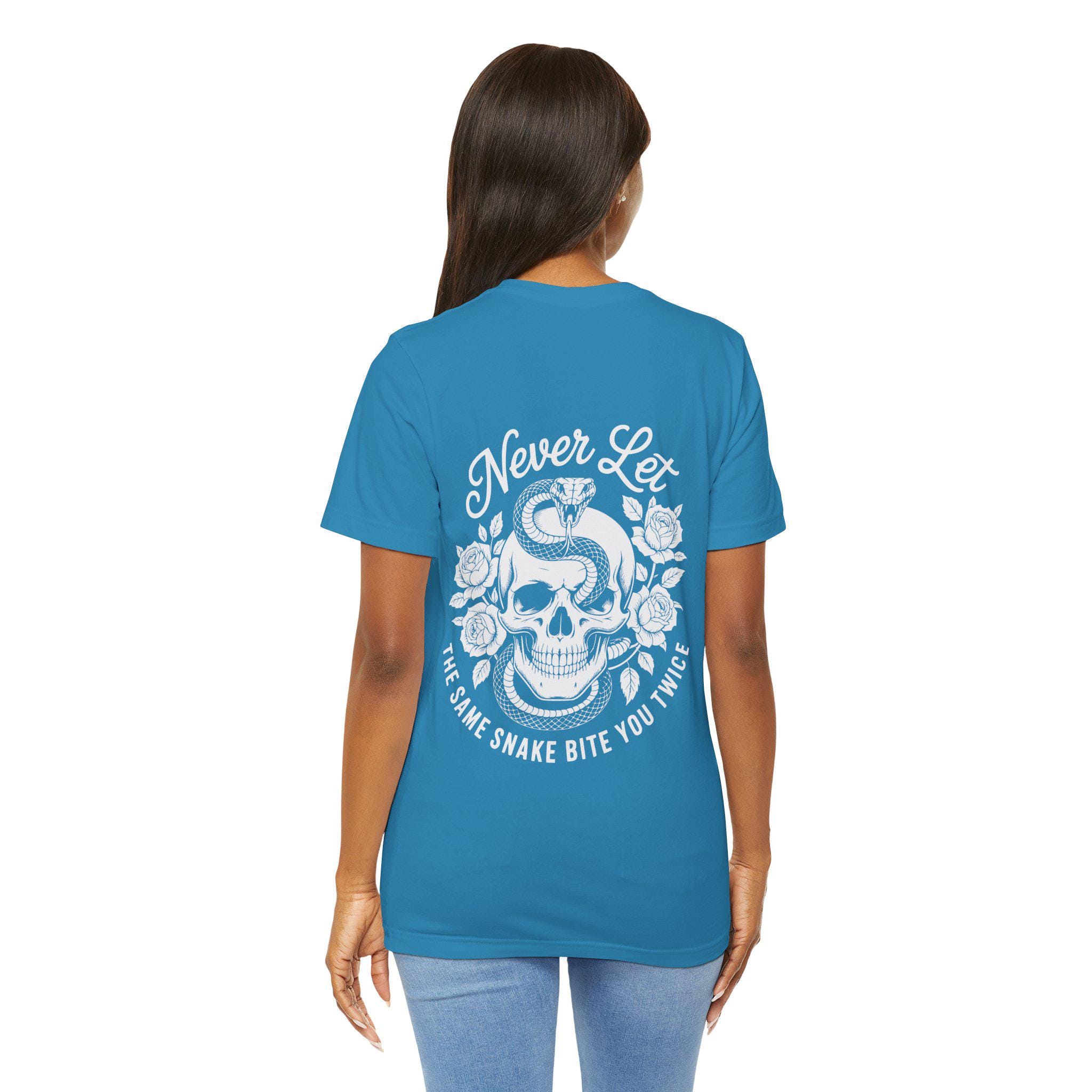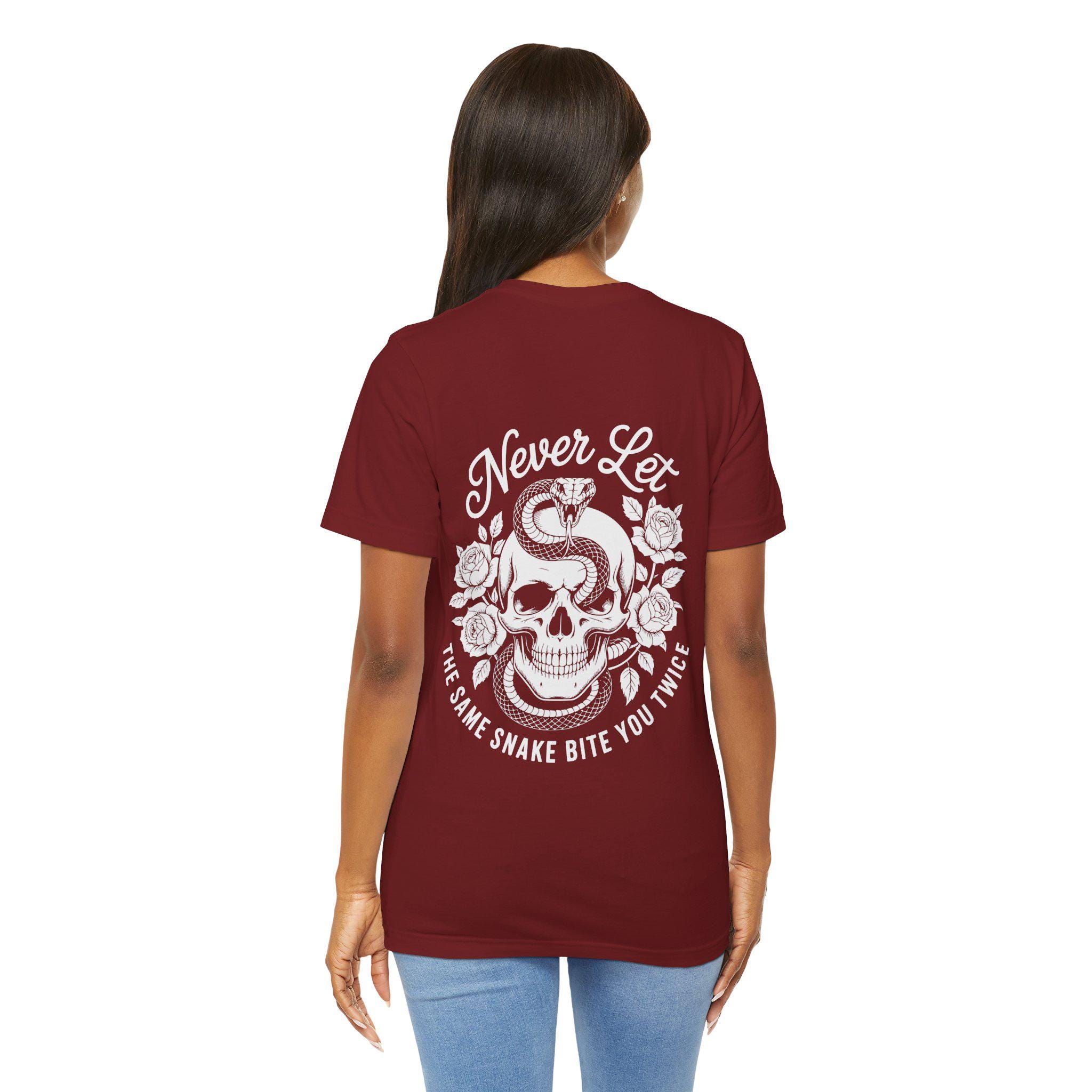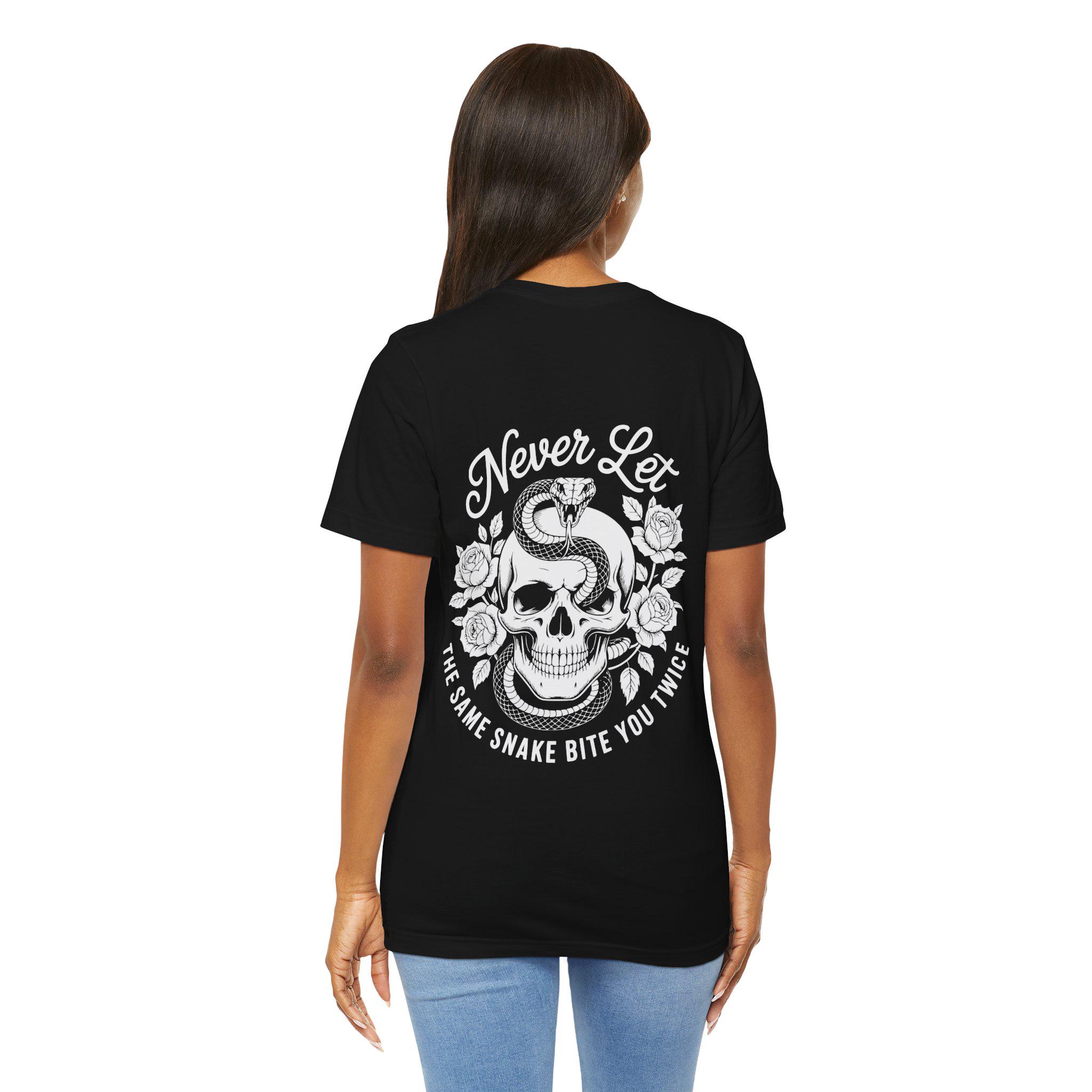 This lightweight crew tee carries a bold, vintage-inspired design for people who wear their grit on their sleeve. A coiled cobra crowns a skull framed by blooming roses, with the motto “Never Let the Same Snake Bite You Twice” arcing above and below — equal parts defiant and reflective. The soft Airlume combed cotton feels breathable against skin, while the retail cut and ribbed crewneck keep the silhouette clean and easy to layer. Wear it on long drives, late-night shows, or when you need a quiet reminder to learn and move on. The monochrome print pops against darker fabrics, giving the artwork a hand-inked look that reads like an old tattoo brought to tee form.