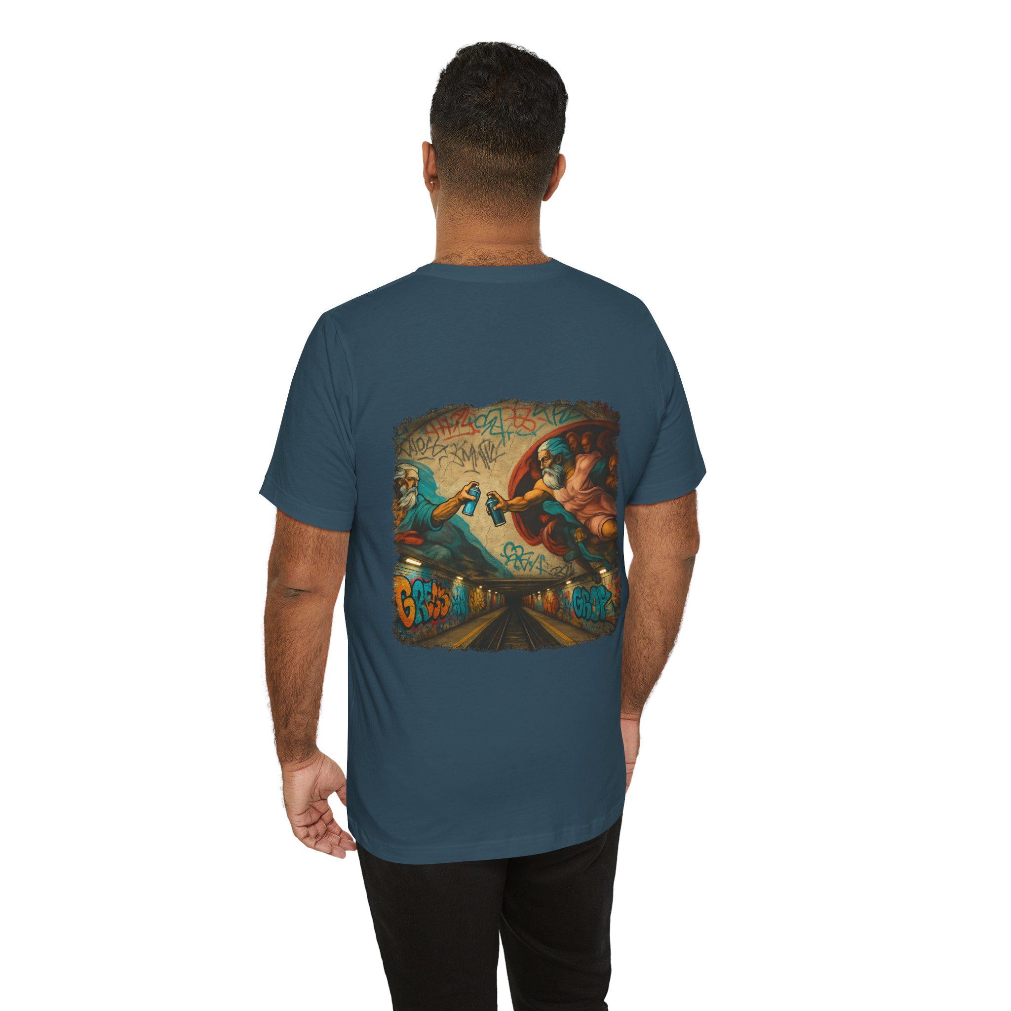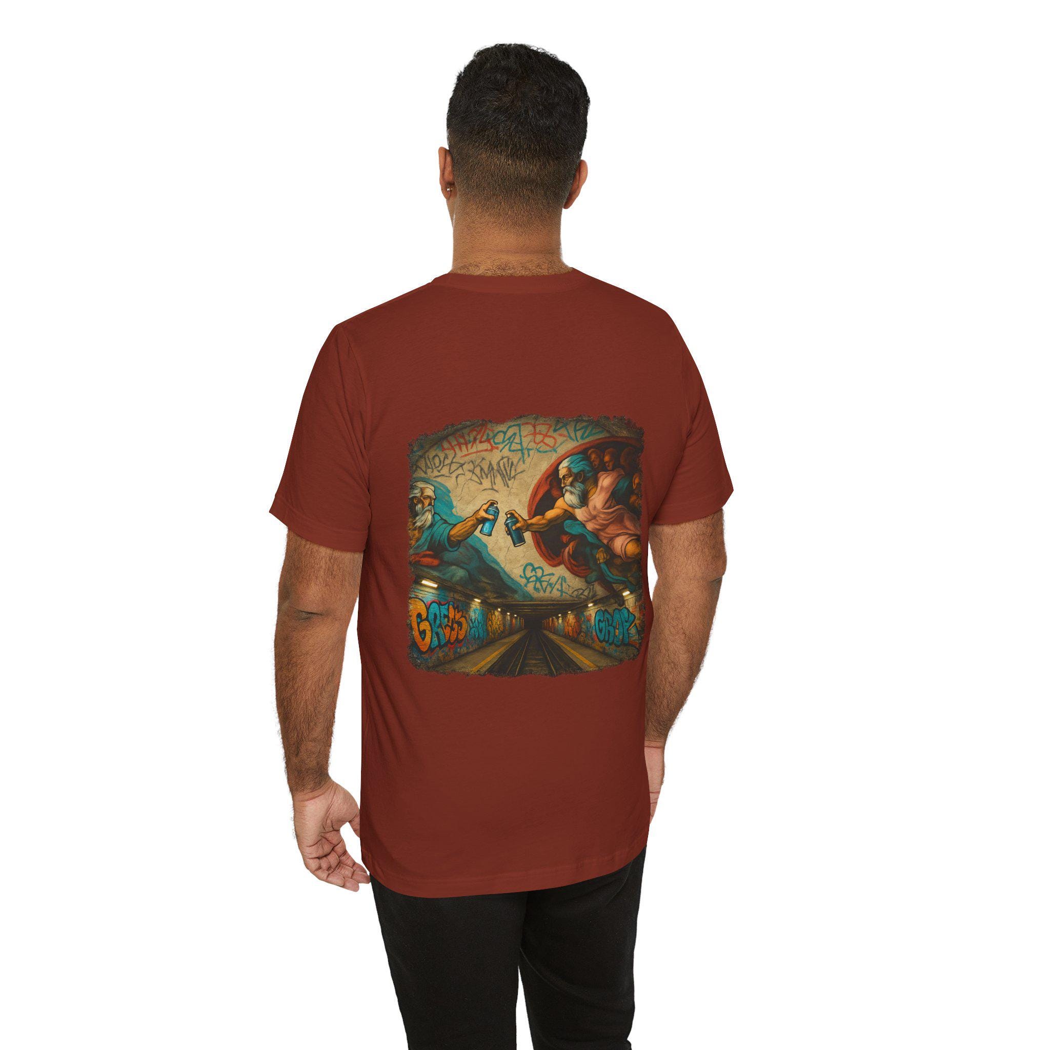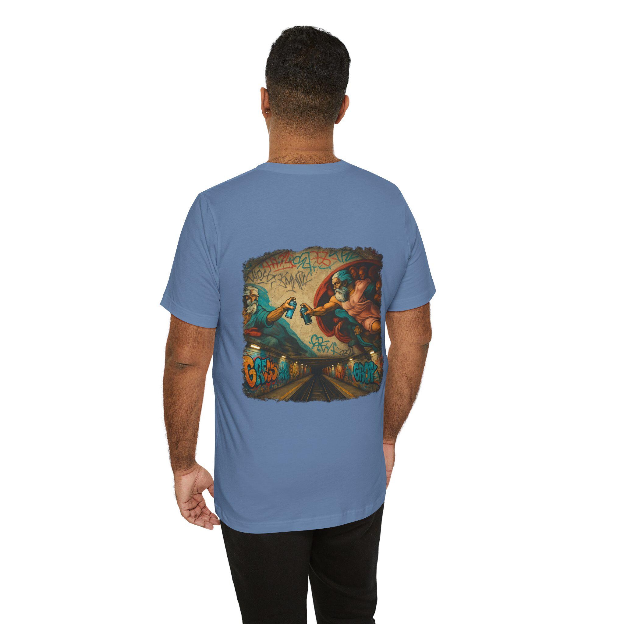 A soft, breathable crew-neck tee that wears like a favorite from day one. The lightweight Airlume combed and ring-spun cotton gives a smooth hand and clean drape, while side seams and shoulder tape keep the shape through frequent wear. The back features a bold, graffiti-infused mural print — a modern twist on classical imagery — that brings color and attitude without feeling heavy. Tear-away label and careful construction make it comfortable against skin. Built with responsible manufacturing standards, this shirt balances streetwise design with everyday comfort.