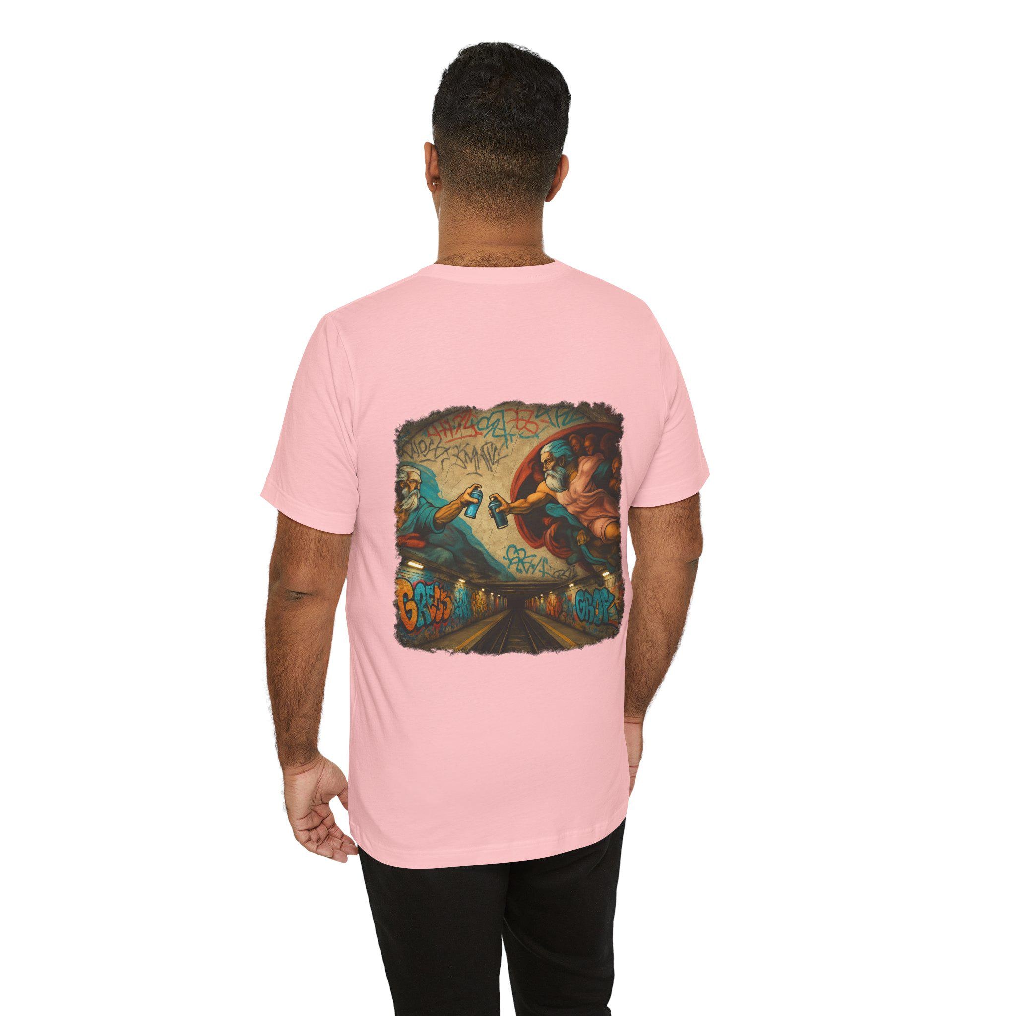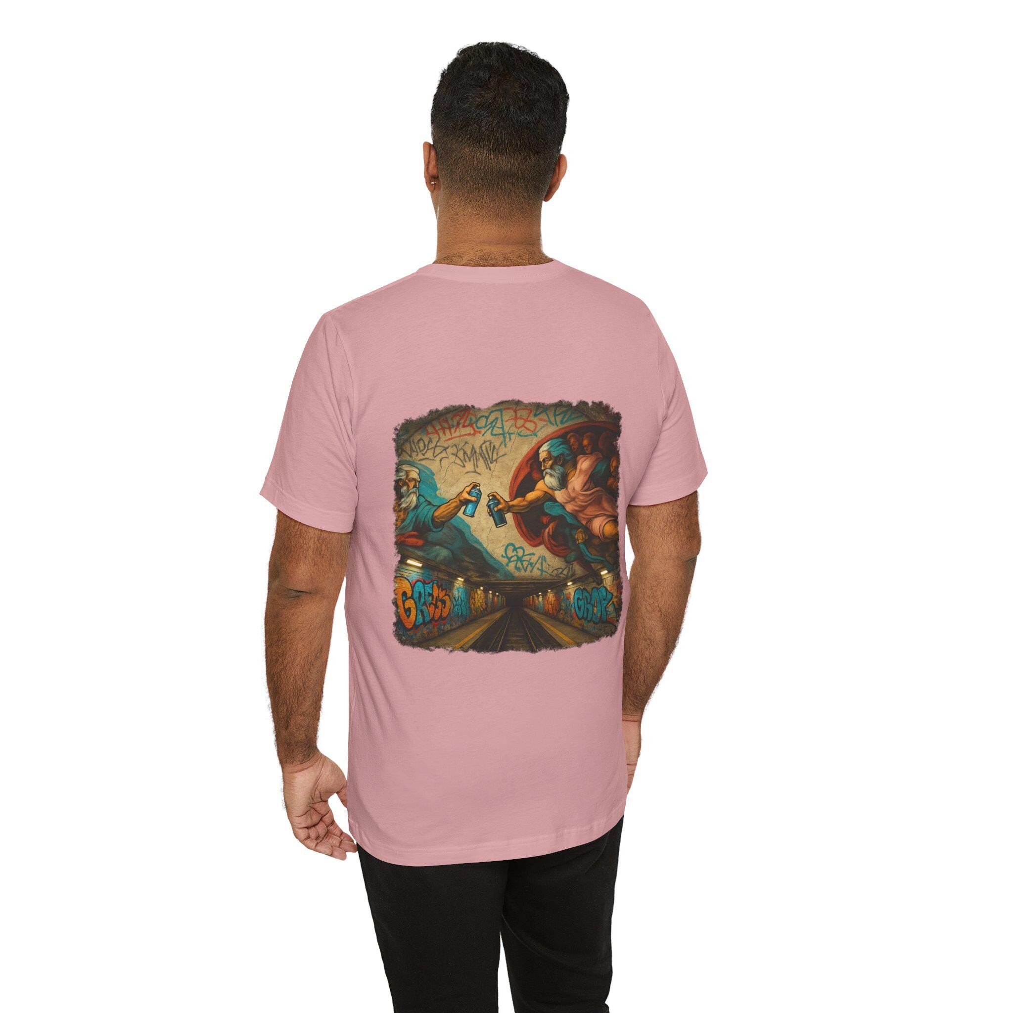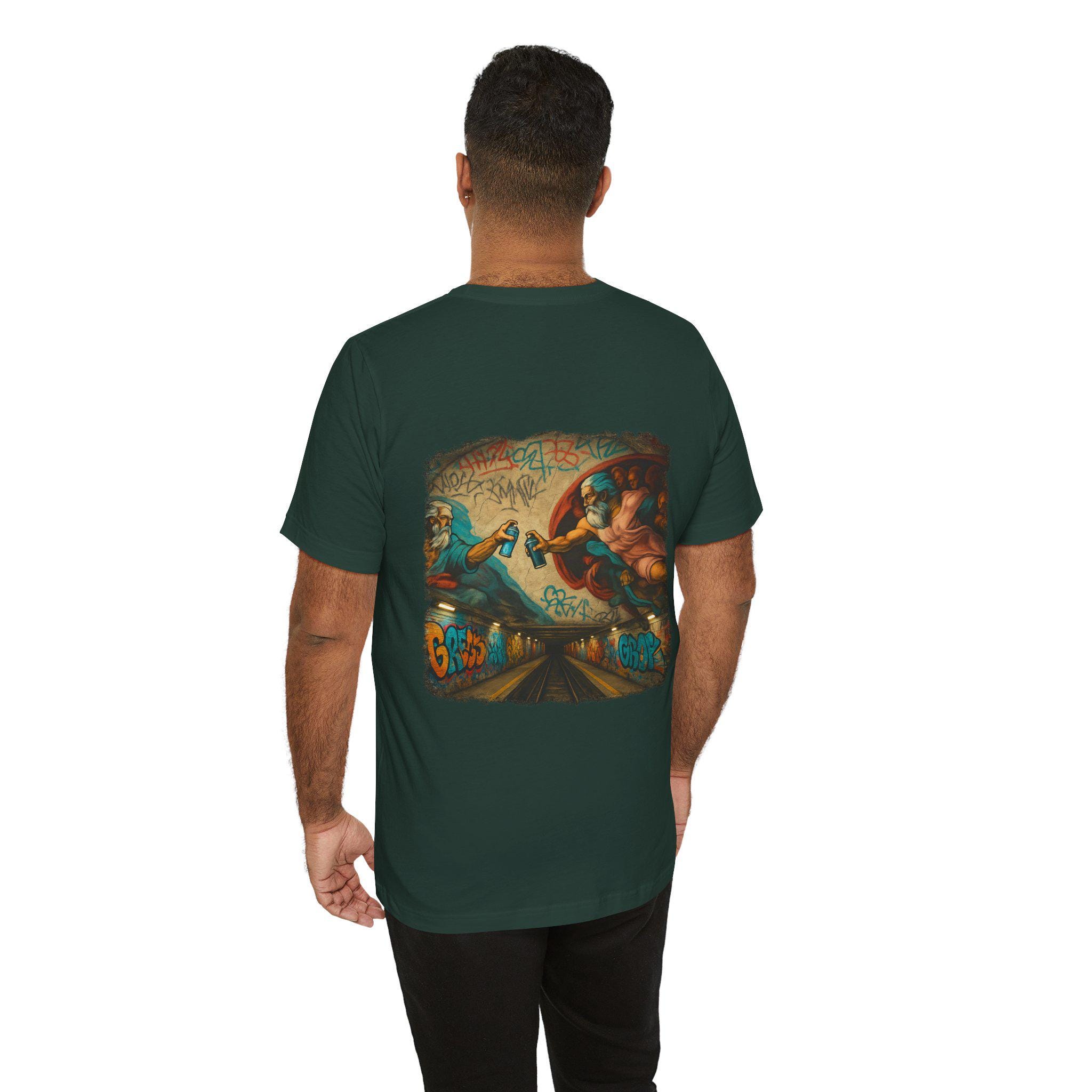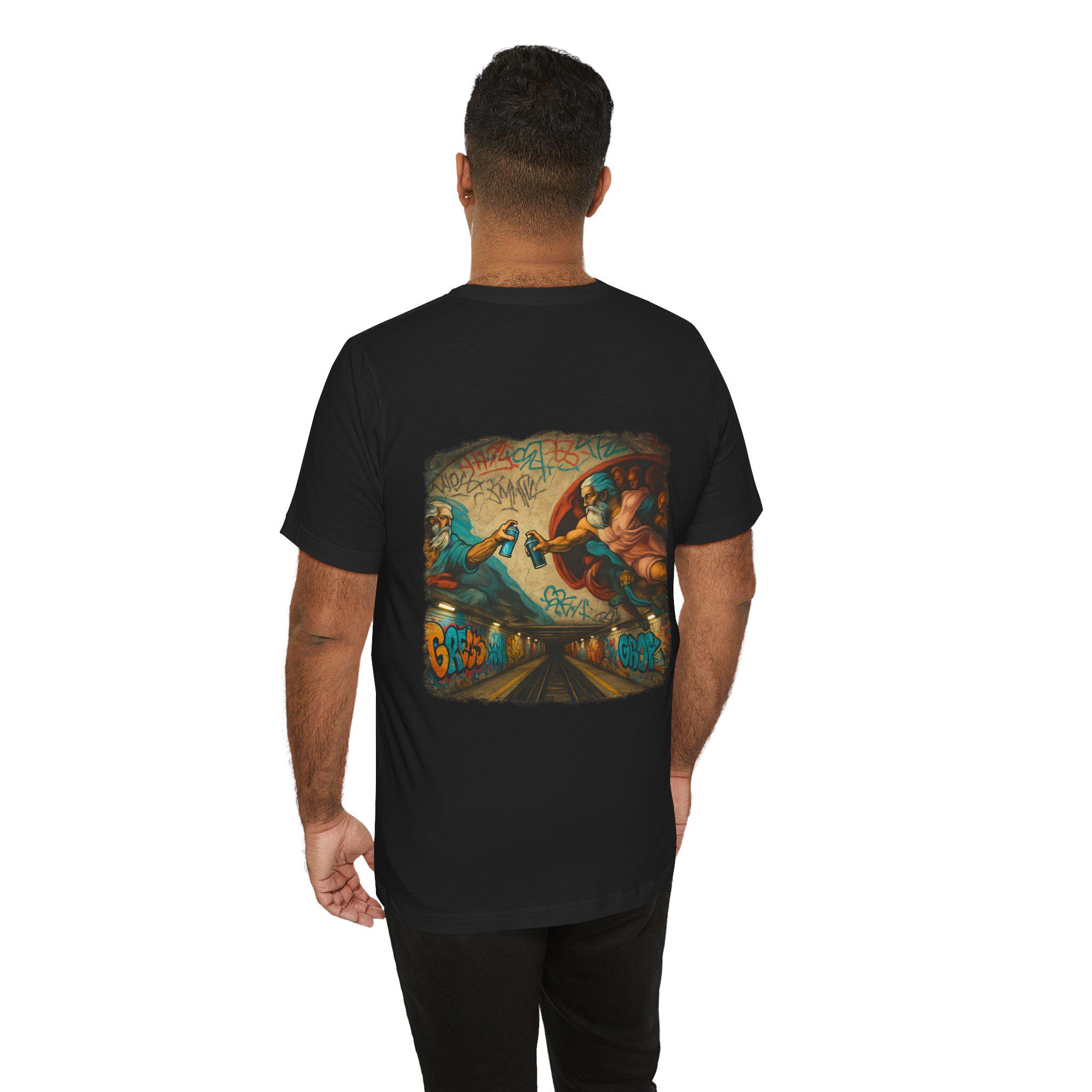 A soft, breathable crew-neck tee that wears like a favorite from day one. The lightweight Airlume combed and ring-spun cotton gives a smooth hand and clean drape, while side seams and shoulder tape keep the shape through frequent wear. The back features a bold, graffiti-infused mural print — a modern twist on classical imagery — that brings color and attitude without feeling heavy. Tear-away label and careful construction make it comfortable against skin. Built with responsible manufacturing standards, this shirt balances streetwise design with everyday comfort.